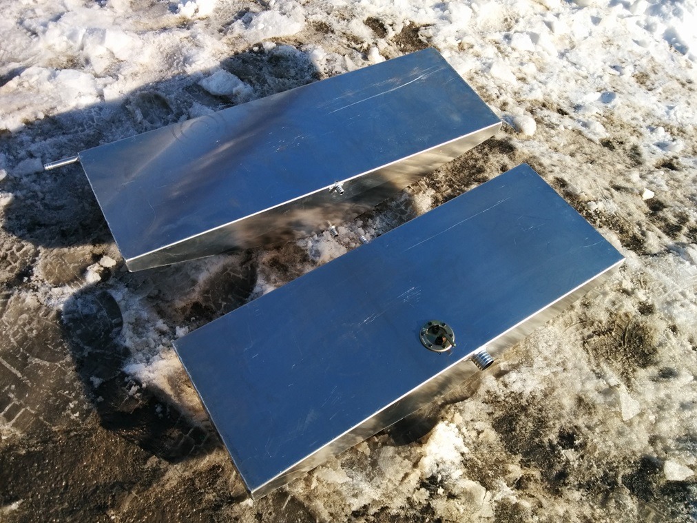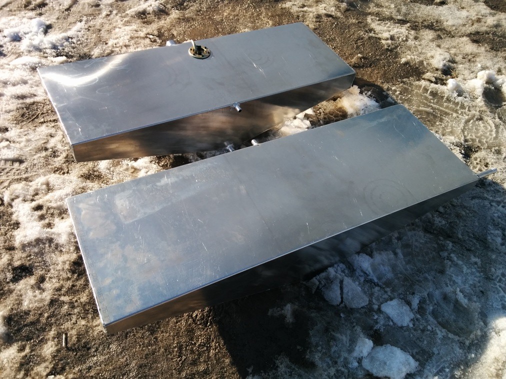 Двухсекционный бензобак предназначен для установки под слани (настил). Емкость бака 94 л, секций – 48 и 46 л. Секции соединяются переливными штуцерами. Вывод горловины – на рецесс.